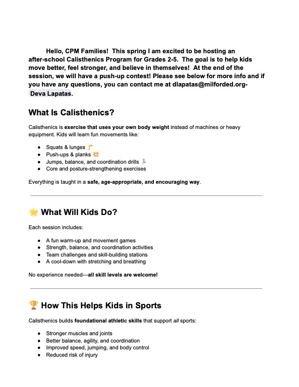 ***Calisthenics w/ Ms. Lapatas: Thursdays (4/16-5/21): Registration open: please see flyer below. Grades 2-5