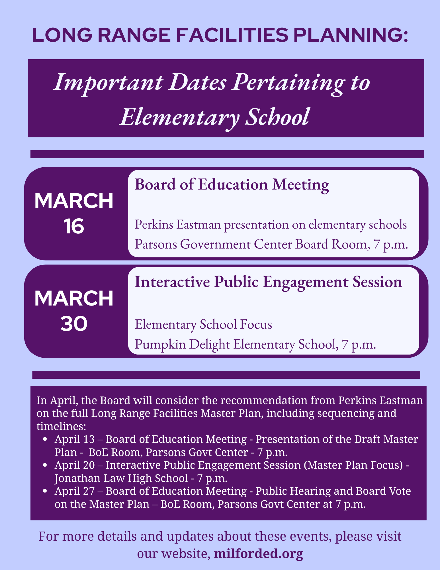 We are pleased to announce that Kindergarten Registration for the 2026-2027 school year will open on Monday, January 12, 2026. If you have a child who will be starting Kindergarten in the fall, registration information will be posted to the district website www.milforded.org. You must register your child for Kindergarten at the school determined by your street address, unless placed by Pupil Personnel Services. School/Street Assignments are available on the district website under “District Information.”