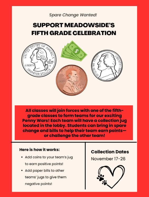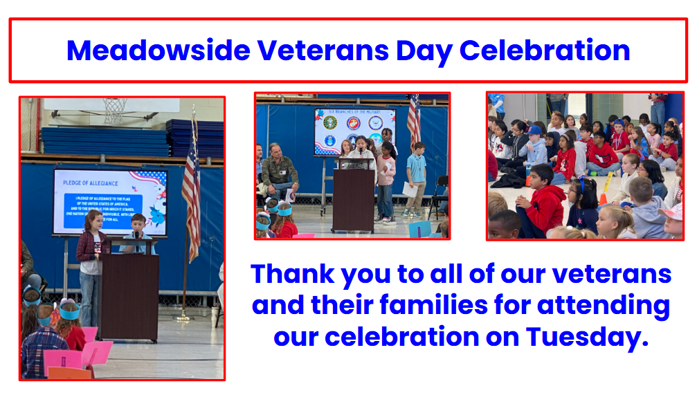 It has been a wonderful first week for me at Meadowside. Gail and I met prior to her departure, and I am on track to continue the great work already happening here. My focus this week has been to get my bearings and visit as many classrooms as possible. The Veterans Day assembly