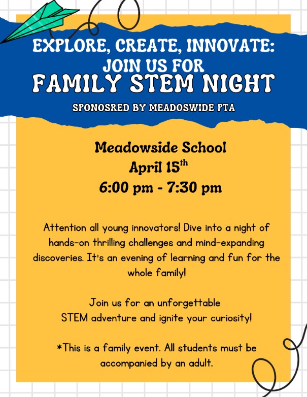Don’t forget to mark your calendars for our upcoming Family STEM Night on April 15th from 6:00–7:30 PM at Meadowside! Sponsored by our PTA, this exciting evening will be filled with hands-on challenges, creative problem-solving, and opportunities for students to explore, create, and innovate. It’s a wonderful chance for families to learn and have fun together while sparking curiosity and a love of discovery. We hope to see many of you there! (Please note that this is a family event and all students must be accompanied by an adult.)